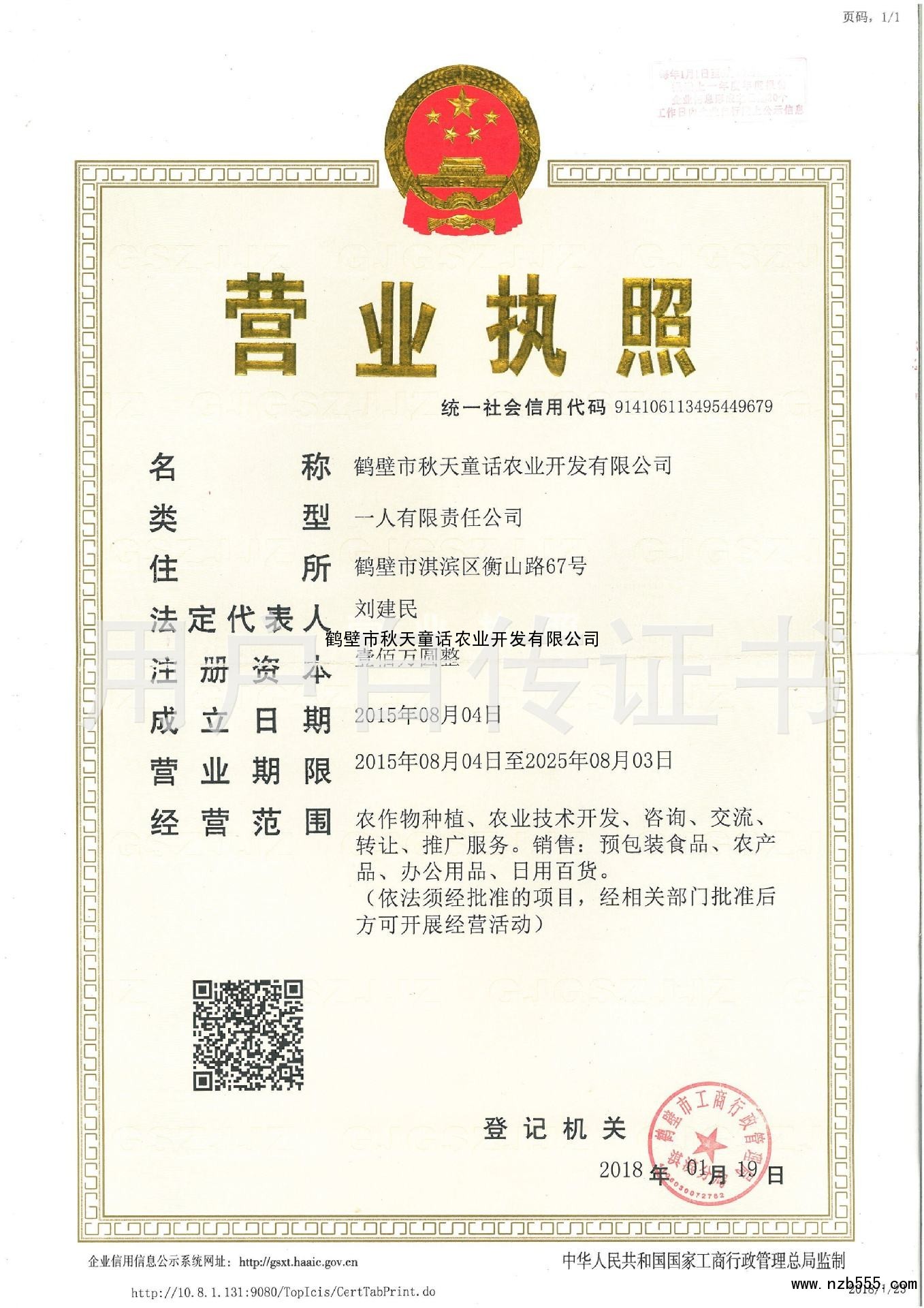 發證機構:   鶴壁市工商行政管理局淇濱分局 發證時間 :   2018-01-19