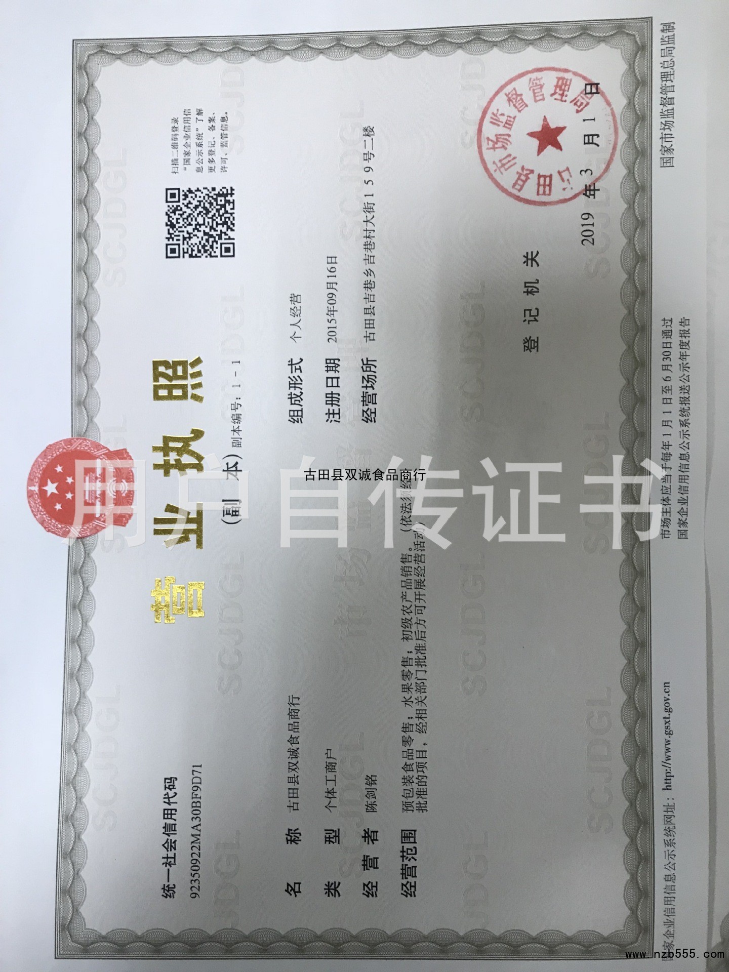 發證機構:   古田縣市場監督管理局 發證時間 :   2019-03-01