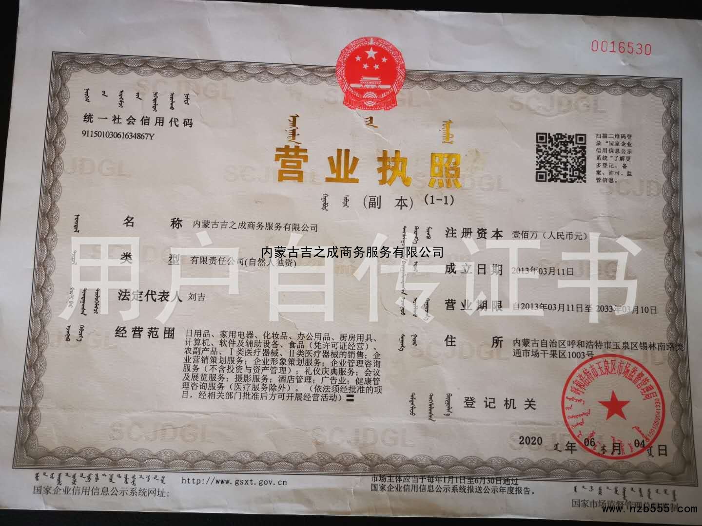 | 發(fā)證機(jī)構(gòu): | 呼和浩特市玉泉區(qū)市場(chǎng)監(jiān)督管理局 | 發(fā)證時(shí)間 : | 2020-06-04 |