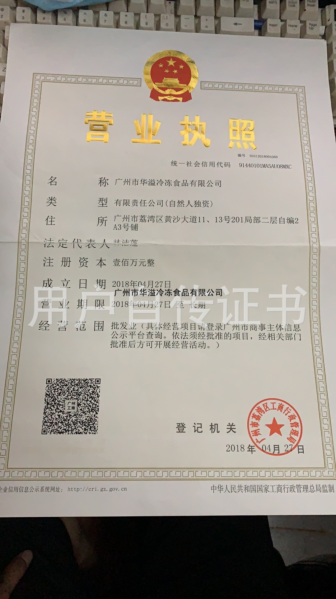 | 發(fā)證機(jī)構(gòu): | 廣州市荔灣區(qū)工商行政管理局 | 發(fā)證時(shí)間 : | 2018-04-27 |