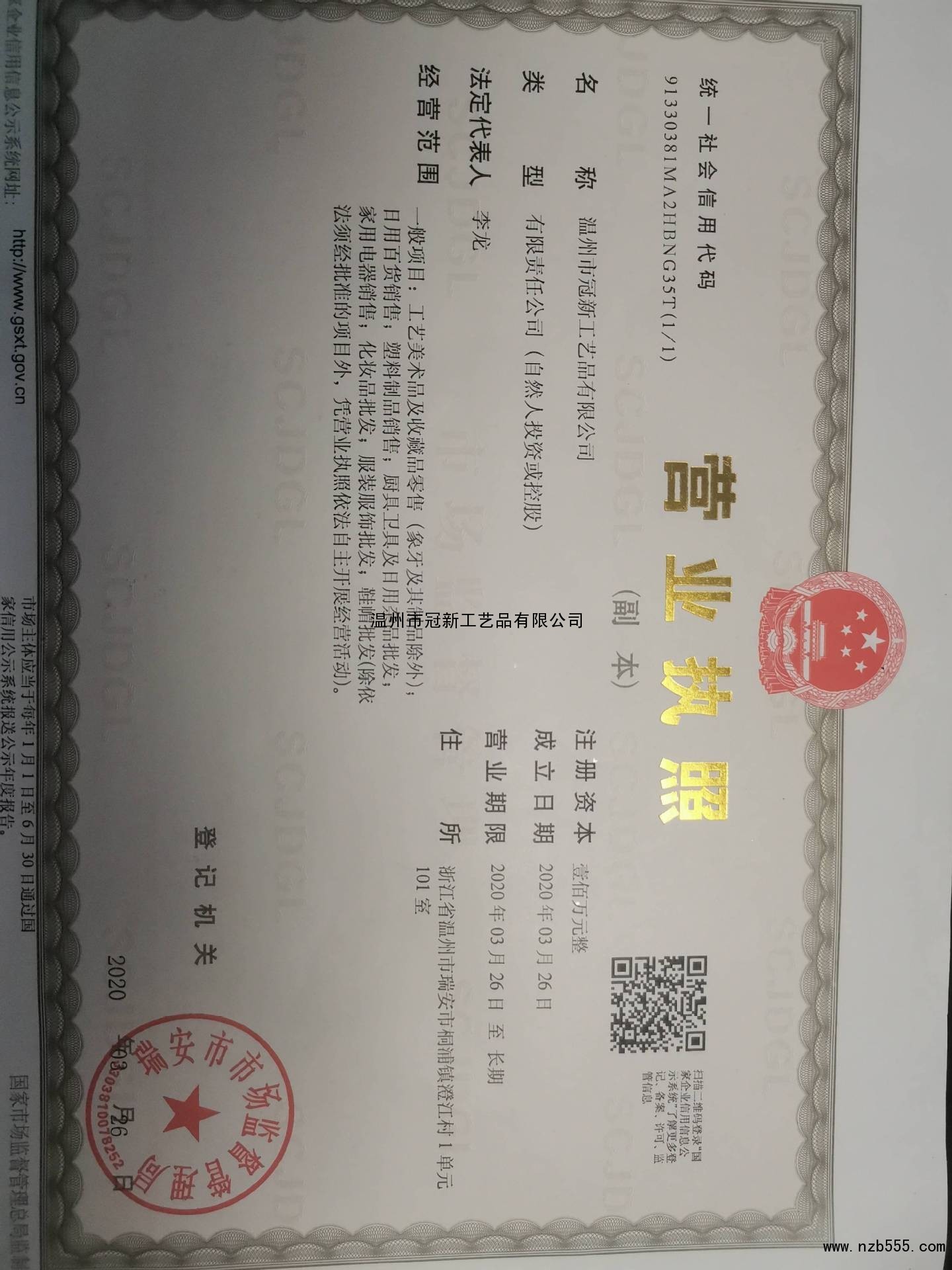 | 發(fā)證機(jī)構(gòu): | 瑞安市市場(chǎng)監(jiān)督管理局 | 發(fā)證時(shí)間 : | 2020-03-26 |