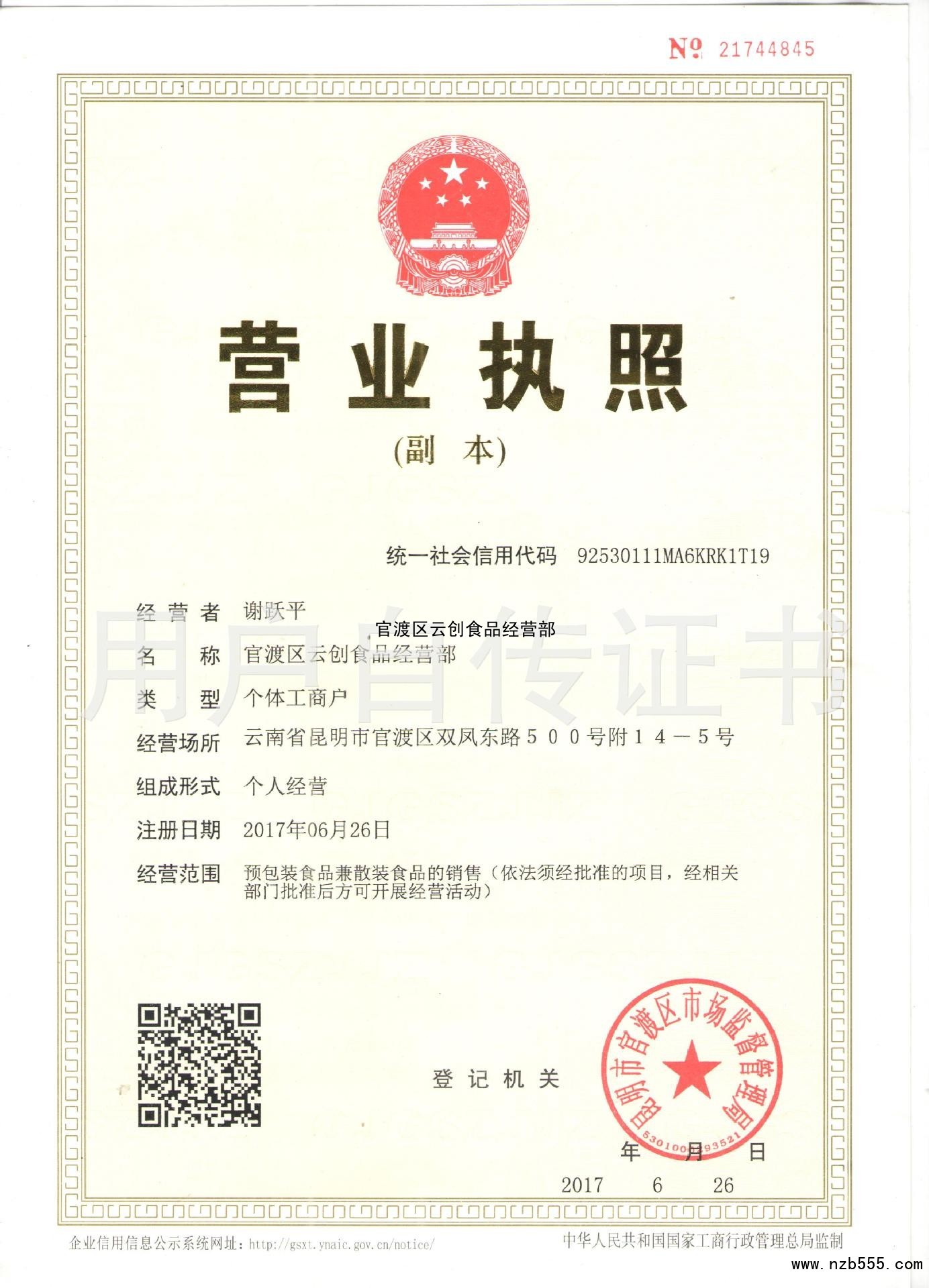 | 發(fā)證機(jī)構(gòu): | 昆明市官渡區(qū)市場(chǎng)監(jiān)督管理局 | 發(fā)證時(shí)間 : | 2017-06-26 |