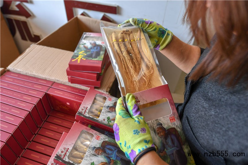 9月25日,在吉林省靖宇縣“老農夫”電商服務中心,工作人員郝金玲在檢查人參品質。新華社記者 張楠 攝