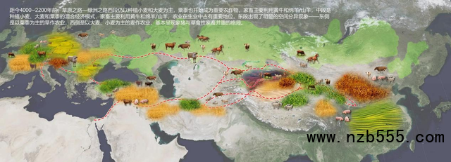 距今4000-2200前年草原之路-綠洲之路沿線地區農業擴散交流和生業模式格局示意圖