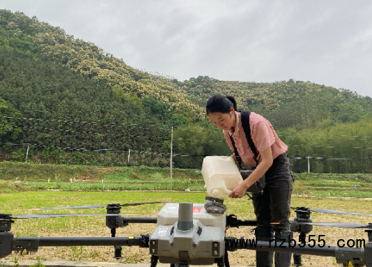 黎穎鈞正在給植保無人機(jī)補(bǔ)充藥液。(受訪者供圖)