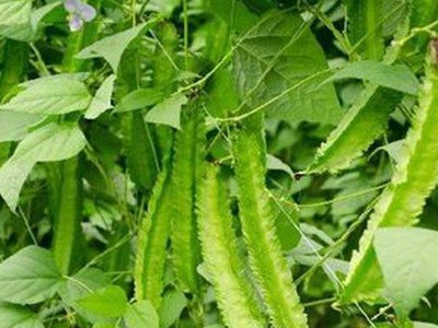 1四棱豆(學名:Psophocarpus tetragonolobus (Linn.) DC.)是豆科四棱豆屬一年生或多年生攀援草本植物。莖長可達3米或更長,小葉片卵狀三角形,全緣,先端急尖或漸尖,基部截平或圓形;總狀花序腋生,小苞片近圓形,花萼綠色,鐘狀,旗瓣圓形,翼瓣倒卵形,淺藍色,花藥同形;莢果四棱狀,黃綠色或綠色,邊緣具鋸齒;種子各種顏色,近球形,邊緣具假種皮。10-11月結果